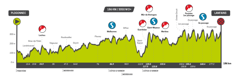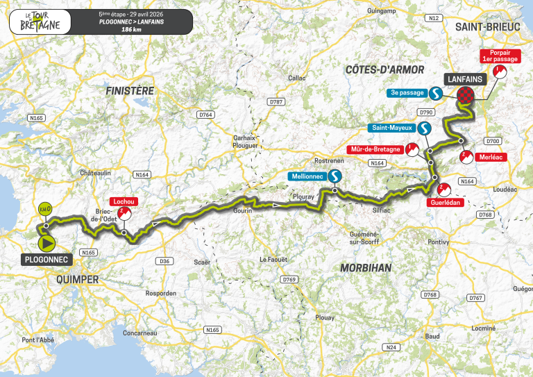 L’étape reine de cette 59ème édition emmènera les coureurs du pays de Quimper vers les Côtes-d’Armor. Il s’agit très certainement de l’étape la plus difficile jamais tracée sur un Tour de Bretagne. Il faudra gravir pas moins de 3100 mètres de dénivelé positif en 186 kilomètres, dont plus de la moitié sur les 70 derniers kilomètres. A partir de Guerlédan, c’est une guerre totale qui est annoncée. Entre les bonifications (malicieusement placées) à aller chercher quelques kilomètres seulement après le sommet de Mûr-de-Bretagne et le circuit final de Lanfains particulièrement difficile, le classement général devrait être bien éclairci au soir de cette 5e étape.